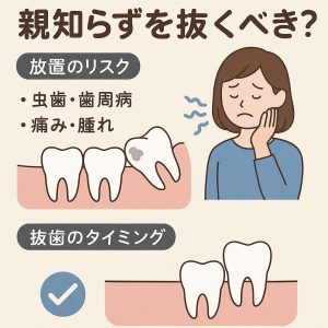 親知らずが完全に埋まっておらず、痛みや腫れを繰り返す場合は早めの抜歯が推奨されます。
